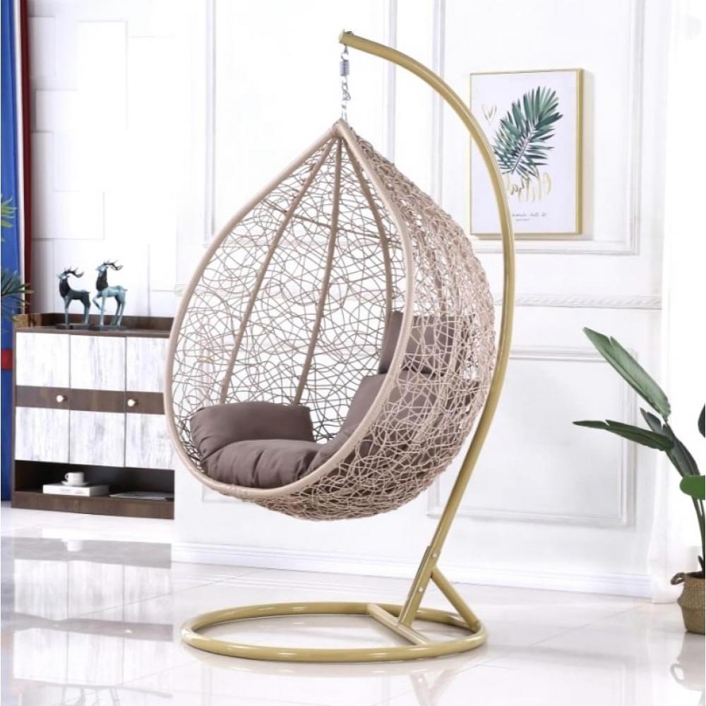 Размер: H119хW107хD71 см Стойка: H2,0xD1,0 м, Каркас сталь. Материал плетения на корзине: искусственный ротанг бежевого цвета. Подушка серая. Ткань с водоотталкивающей пропиткой. Допустимая нагрузка: 120 кг. Объем: 1,0м3, вес 30 кг